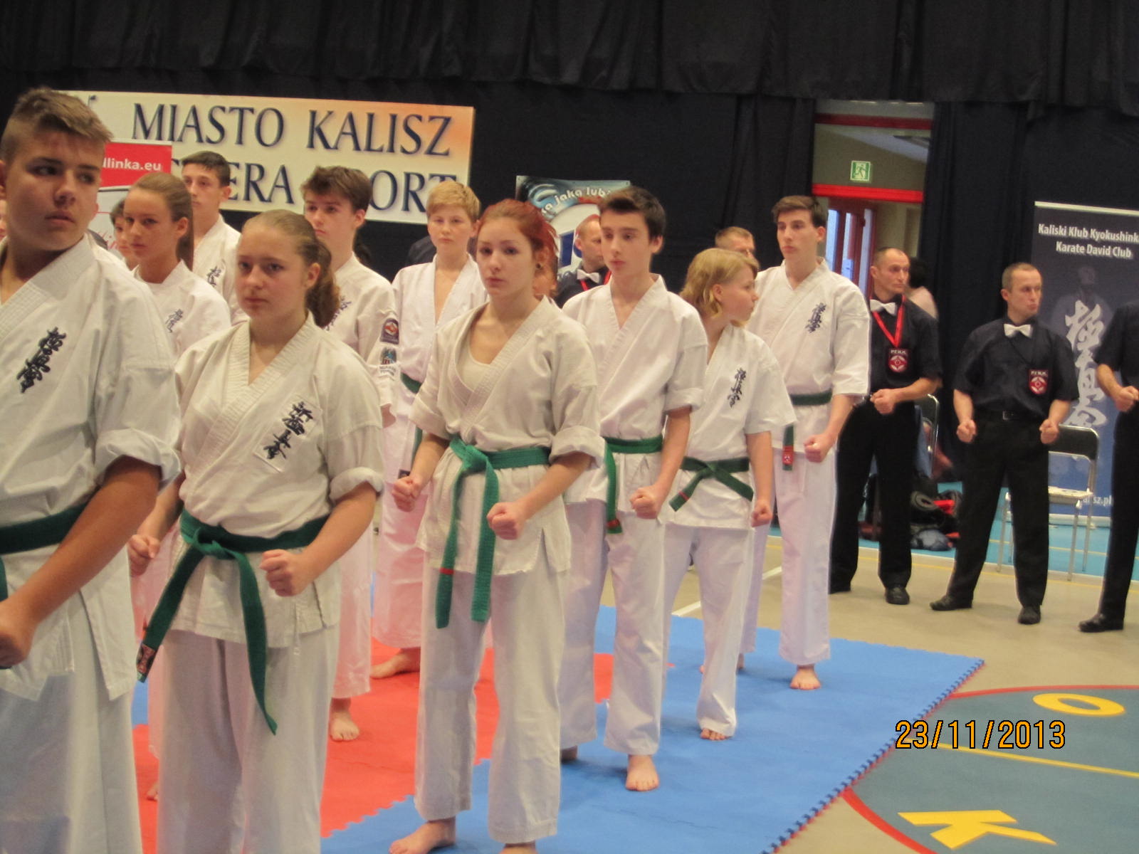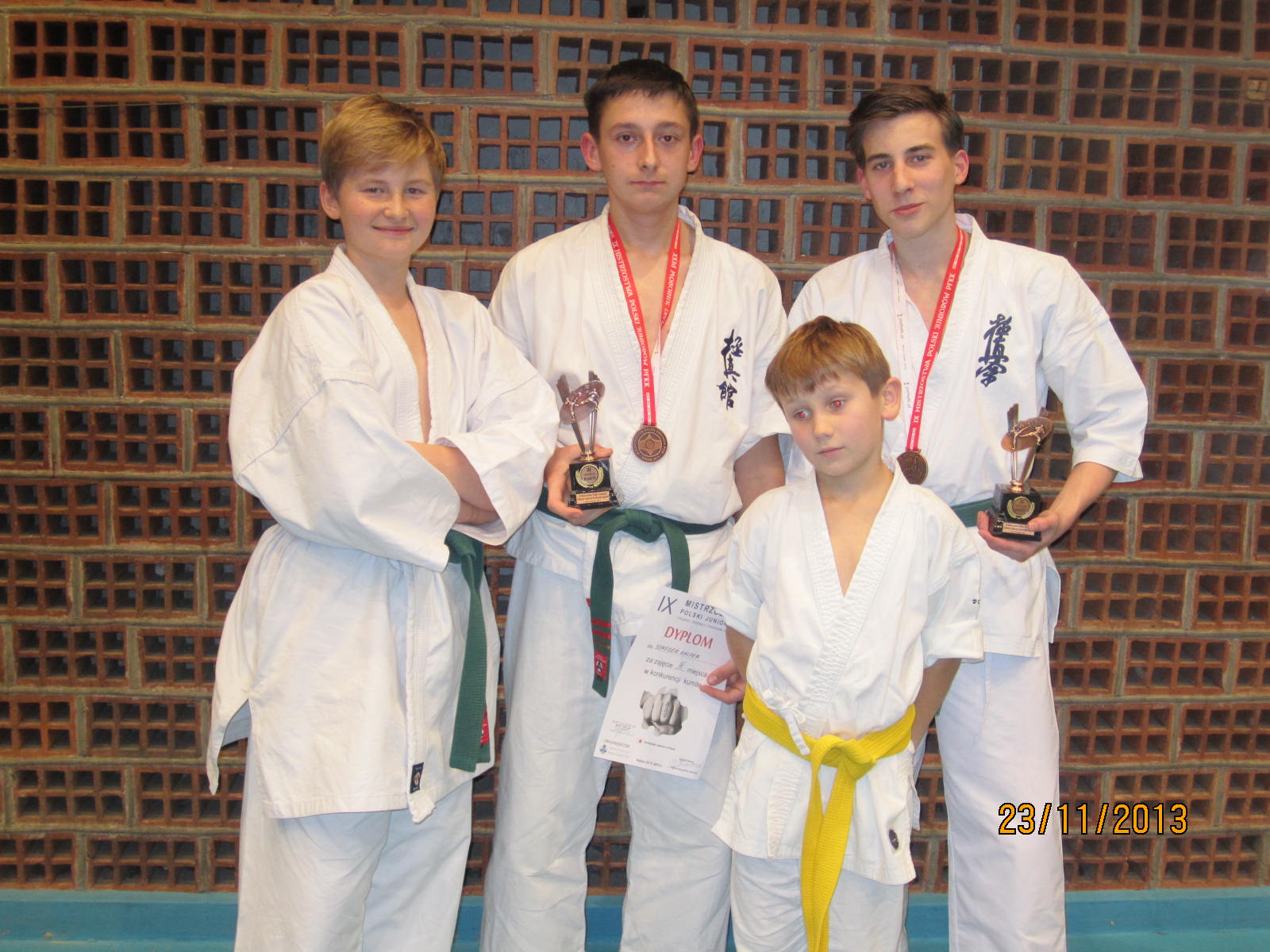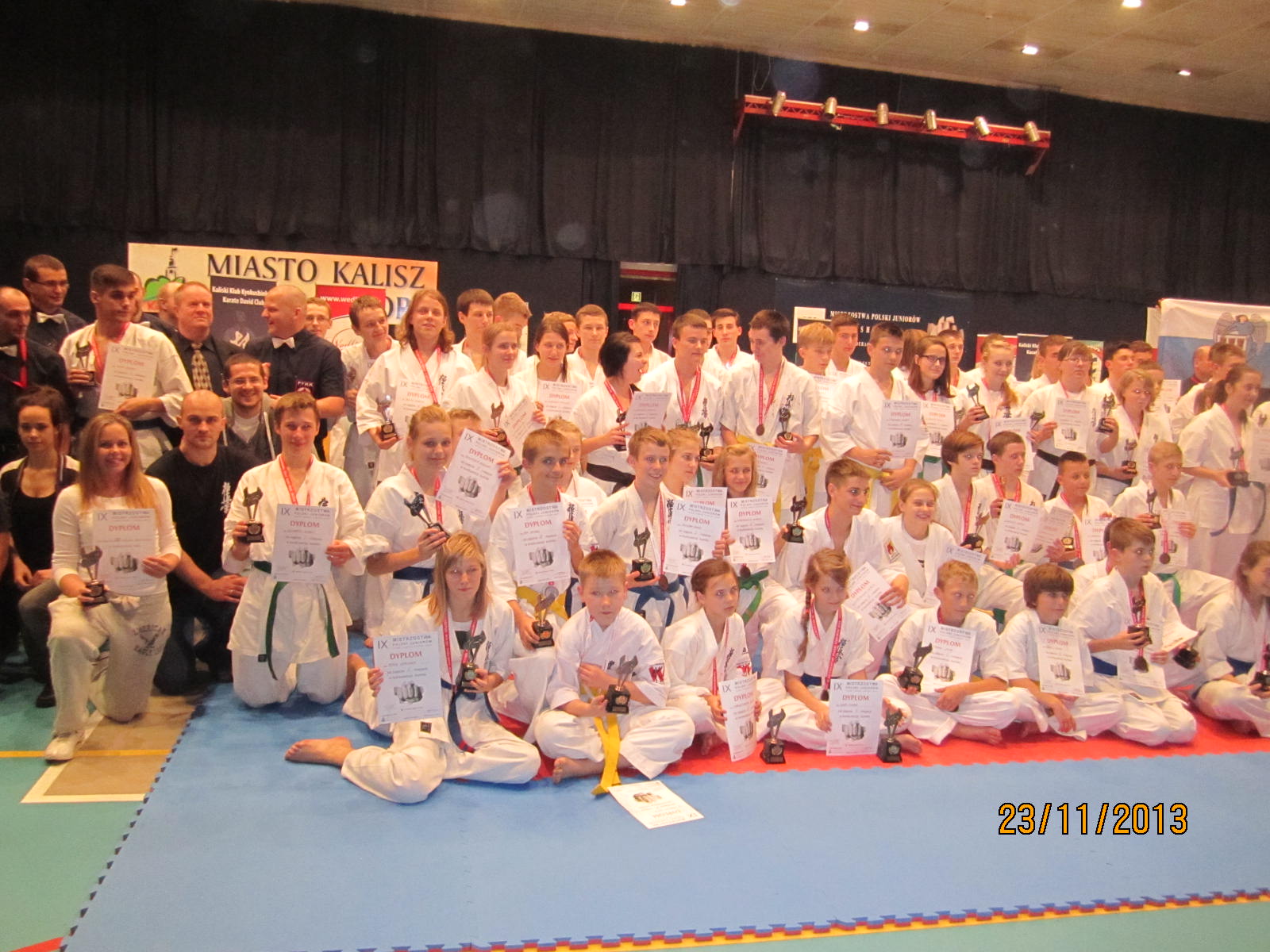 W dniu 23 listopada 2013 roku odbyły się w Kaliszu Mistrzostwa Polski Juniorów PFKK. Nasz klub reprezentowało 4 zawodników – Kacper Szreder, Damian Walczyk, Jędrzej Dziewior i Rafał Wasiuta, oraz sensei Marek Wilusz jako opiekun. Wszyscy najpierw wystąpili najpierw w konkurencji kata. Mimo dobrego występu nie udało im się awansować do drugiej tury. Rafał Wasiuta i Jędrzej Dziewior przegrali swoje pierwsze walki i odpadli z dalszej rywalizacji. Z kolei Damian Walczyk wygrał swoją walkę przed czasem i awansował do półfinału, gdzie z kolei przegrał po wyrównanej walce i dogrywce. Walkę o 3 miejsce mimo kontuzji odniesionej w poprzedniej walce, również po dogrywce, tym razem wygrał. Również Kacper Szreder rywalizację w konkurencji kumite uplasował się na 3 miejscu.